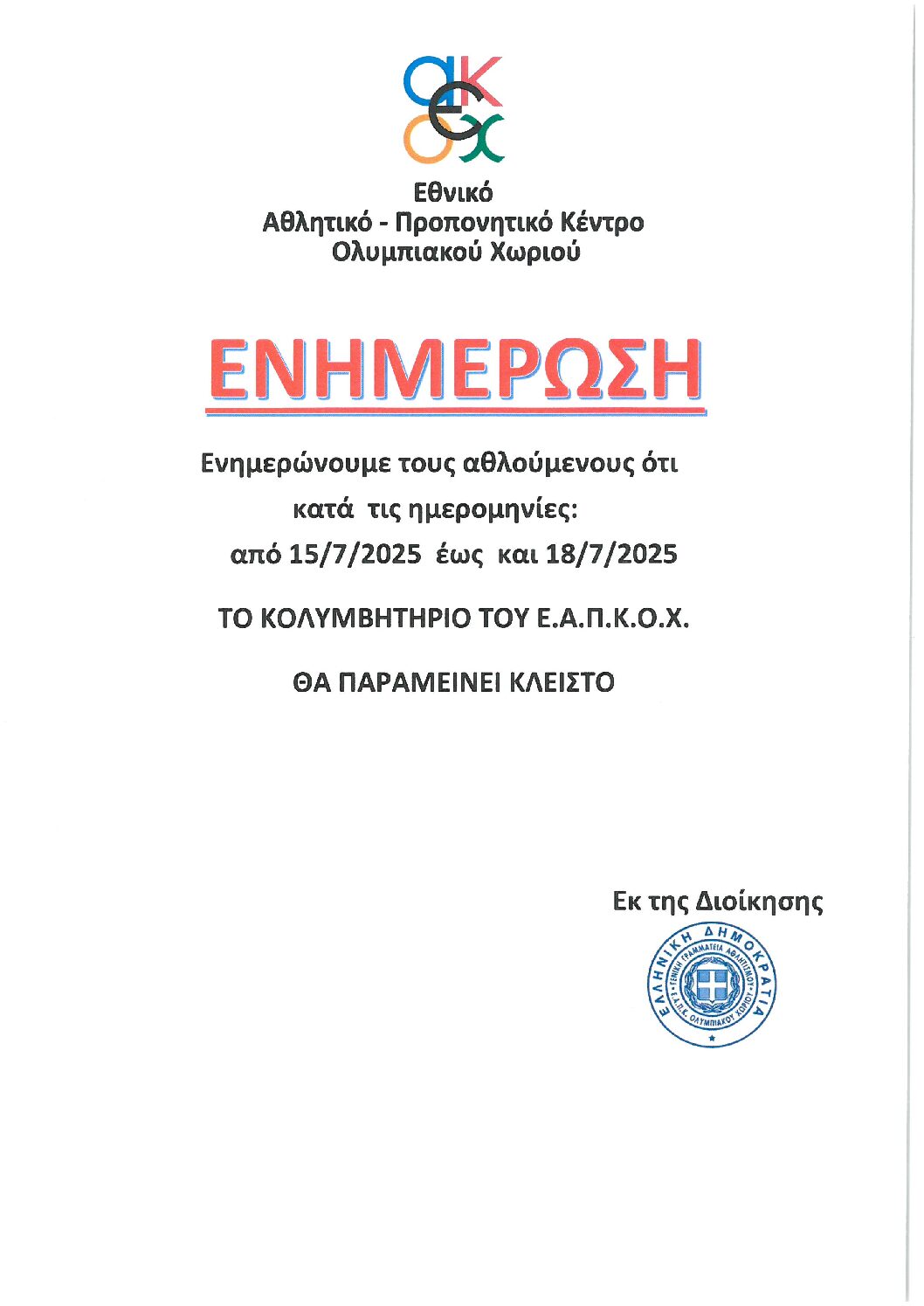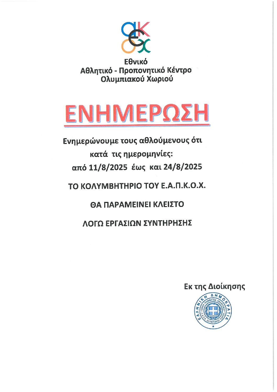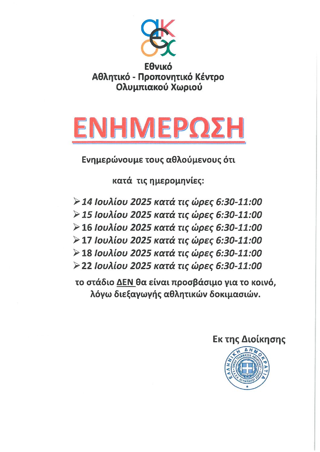 Ενημερώνουμε τους αθλούμενους ότι ο στίβος του αθλητικού μας κέντρου θα παραμείνει κλειστός από20 έως 26 Αυγούστου, λόγω προγραμματισμένων εργασιών.